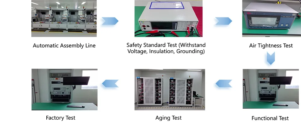 Производ је добио ауторитативне сертификате у земљи и иностранству, укључујући ЦЦЦ (обавезну сертификацију у Кини), ЦЕ (Европска унија), УЛ (Сједињене Државе) и ЕН50498. Усклађен је са стандардима НБ/Т33001-2025 и ГБ31241-2014, осигуравајући електричну сигурност и електромагнетну компатибилност. Поседујемо модерну производну базу и усвајамо кућиште од АБС+ПЦ композитног материјала отпорног на ватру са В0 оценом и ФР-4 ПЦБ плочама од фибергласа. Кључни лемни спојеви се обрађују технологијом таласног лемљења и прошли су ригорозне тестове као што су 5.000 циклуса уметања/вађења, отпорност на вибрације и отпорност на корозију у сланом спреју. Свака јединица пролази кроз 72-часовни тест старења при пуном оптерећењу пре него што напусти фабрику, постижући стопу квалификације од 100%. Успоставили смо свеобухватан систем контроле квалитета који омогућава потпуну следљивост од набавке сировина до испоруке готовог производа.